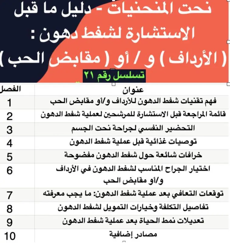 كتاب إلكتروني قبل الاستشارة: فهم شفط الدهون، وخيارات تحديد شكل الجسم، والتحضير للاستشارة، والمخاطر والمضاعفات، والرعاية بعد الجراحة، وتغييرات نمط الحياة بعد الجراحة، والموارد الإضافية ومجموعات الدعم.