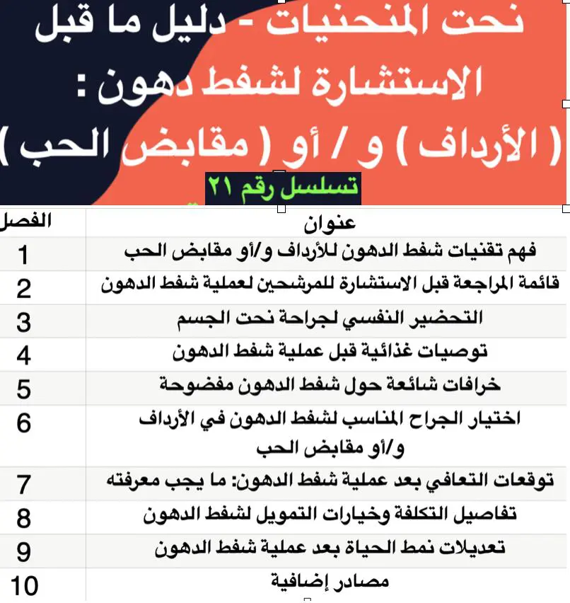 كتاب إلكتروني قبل الاستشارة: شفط الدهون للأرداف و/أو مقابض الحب، قائمة التحقق لشفط الدهون، التحضير النفسي، تفنيد الأساطير الشائعة، اختيار الجراح المناسب، تفصيل التكلفة، تعديلات نمط الحياة بعد شفط الدهون، موارد إضافية ومجموعات دعم.