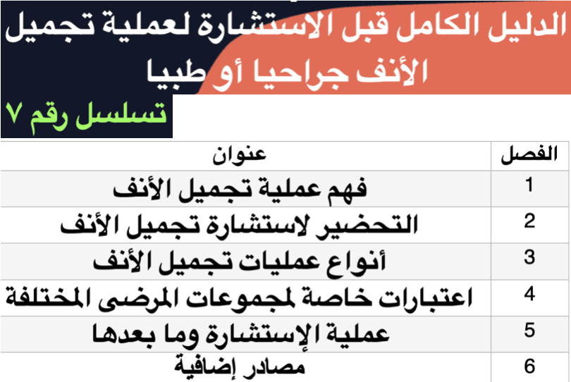.كتاب إلكتروني قبل الاستشارة: عملية تجميل الأنف: جراحية أو طبية، فهم عملية تجميل الأنف، الاستعداد للاستشارة، أنواع عملية تجميل الأنف، اعتبارات خاصة لمجموعات مختلفة من المرضى، موارد إضافية عبر الإنترنت ومجموعات الدعم.