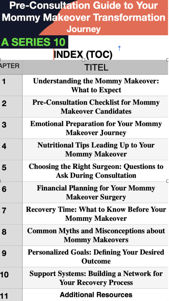 pre-consultation e-book: mommy makeover : what to expect, checklist, emotional preparation, nutritional tips, choosing the surgeon : questions to ask, financial planning, recovery time, common myths, recovery network, additional resources and support groups.