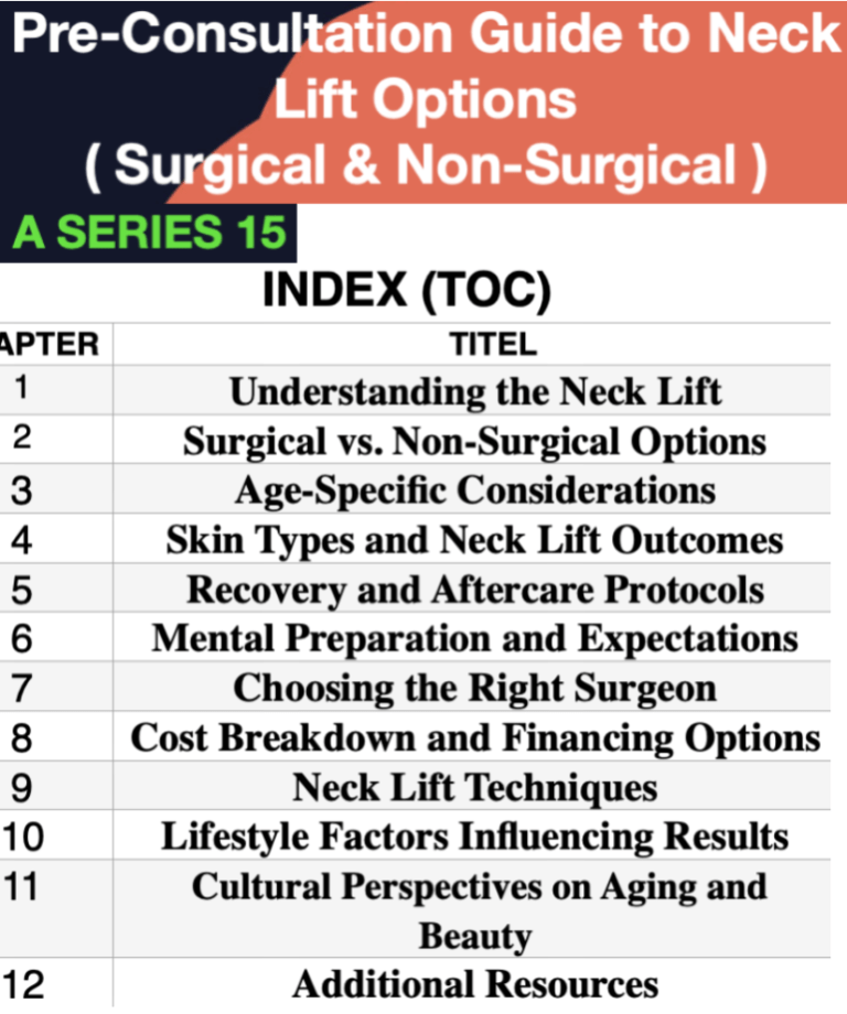 pre-consultation e-book: neck lift explained, surgical vs. non-surgical, age considerations, skin types and neck lift outcomes, recovery and aftercare, mental preparation and expectations, choosing your surgeon, cost breakdown, neck lift techniques, cultural perspective, Additional Resources and support groups..
