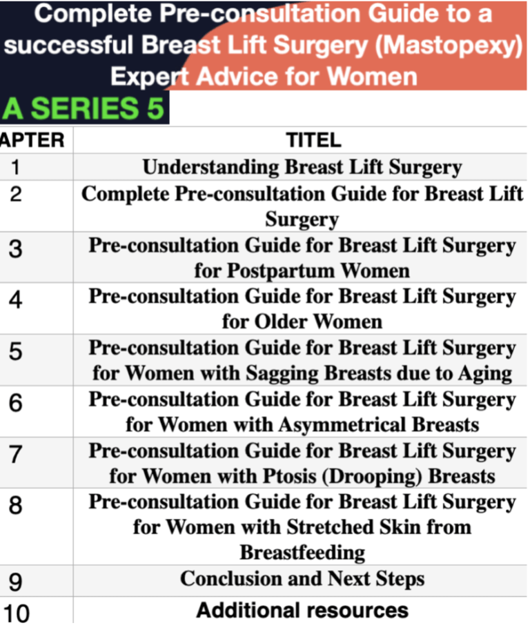 pre-consultation e-book: understanding breast lift surgery for: generals, postpartum women, older women, with asymmetrical breasts, with drooping breasts, with Stretched skin from breastfeeding, lastly additional online resources and support groups