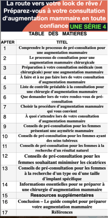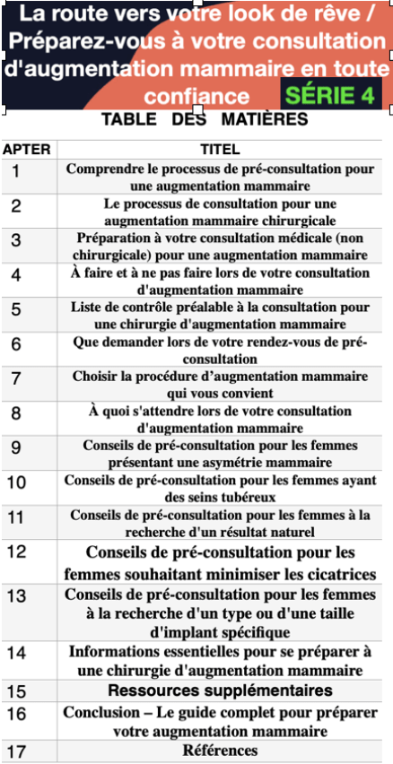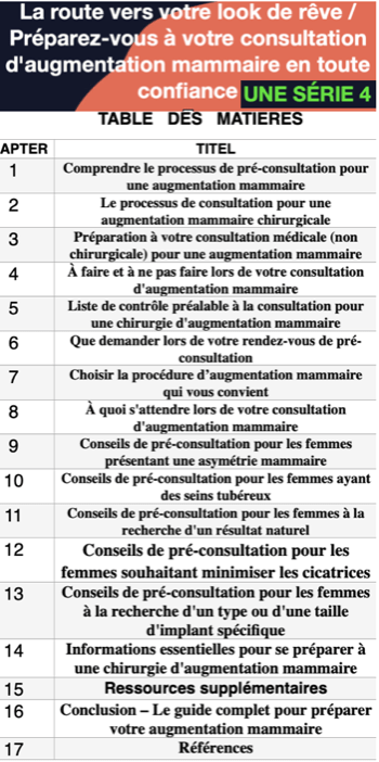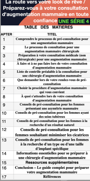 Livre électronique de pré-consultation : augmentation mammaire, choses à faire et à ne pas faire en consultation, liste de contrôle pour la procédure, que demander, choisir la bonne procédure, ceux qui ont : une asymétrie, un bronche tubéreux, qui recherchent un résultat naturel, moins de cicatrices ou un type ou une taille d’implant spécifique et des ressources en ligne et des groupes de soutien.