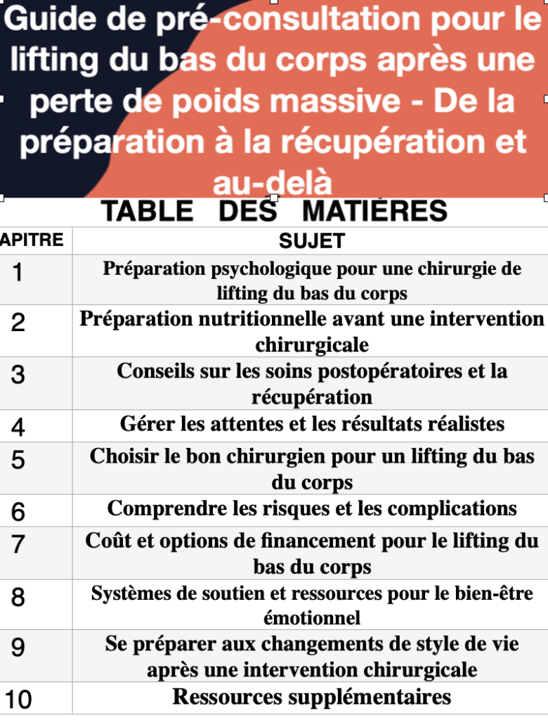 Livre électronique de pré-consultation : relooking de maman : à quoi s’attendre, liste de contrôle, préparation émotionnelle, conseils nutritionnels, choix du chirurgien : questions à poser, planification financière, temps de récupération, mythes courants, réseau de récupération, ressources supplémentaires et groupes de soutien.