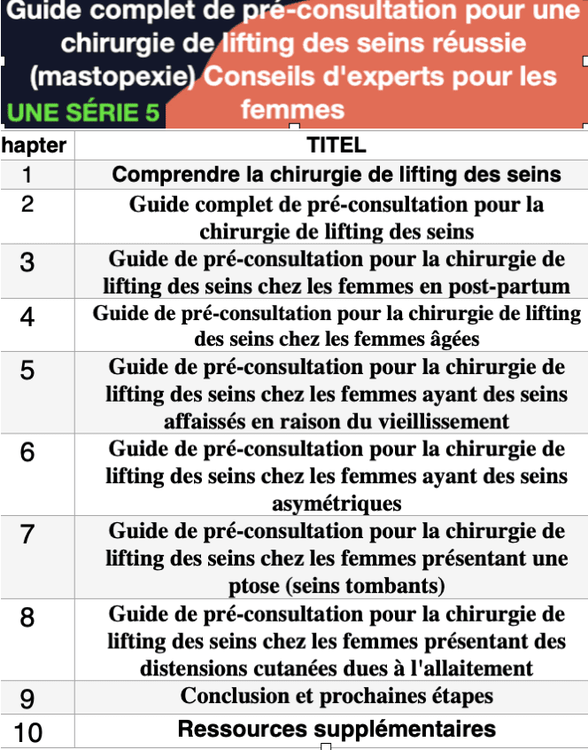 Livre électronique de pré-consultation : comprendre la chirurgie de lifting des seins pour : les généralistes, les femmes en post-partum, les femmes plus âgées, les femmes ayant des seins asymétriques, les femmes ayant des seins tombants, la peau distendue par l’allaitement, et enfin des ressources en ligne supplémentaires et des groupes de soutien