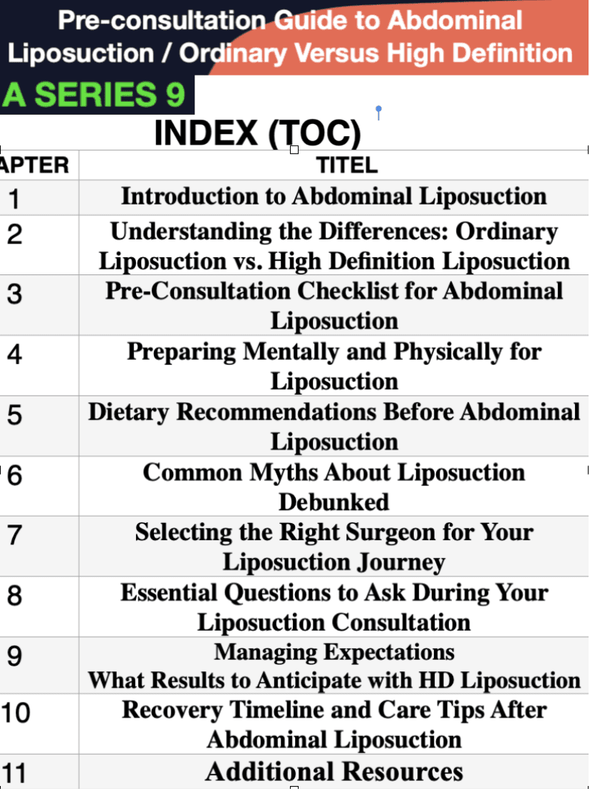 pre-consultation e-book: abdominal liposuction, Ordinary liposuction vs. high definition HD, preparing mentally and physically, common myths debunked, selecting the surgeon, questions to ask, additional resources and support groups.